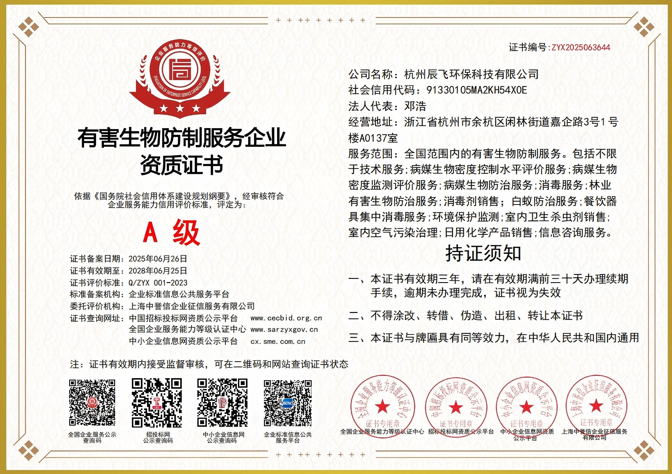 杭州辰飛環(huán)保科技有限公司是一家專業(yè)的PCO有害生物防治服務(wù)機(jī)構(gòu)。是經(jīng)杭州市工商局注冊登記、杭州市白蟻防治管理所、PCO協(xié)會批準(zhǔn)的城市害蟲綜合治理消殺公司,是集除四害、白蟻消殺、除蟲、消毒殺菌、室內(nèi)空氣污染治理、藥械銷售于一體的大型專業(yè)杭州有害生物防治科技有限公司。主要從事新建、擴(kuò)建、改建、裝飾裝修單位建筑物的白蟻防治和白蟻預(yù)防工程,同時(shí)從事工廠、酒店、企事業(yè)單位、住宅小區(qū)和家庭的”四害”消殺和白蟻防治服務(wù),長期向各類型客戶提供杭州白蟻消殺、除蟑螂、除老鼠、除蟲、消毒殺菌等優(yōu)質(zhì)服務(wù)。 本公司自成立以來,秉承“誠信、敬業(yè)、高效、務(wù)實(shí)”的發(fā)展原則,以現(xiàn)...